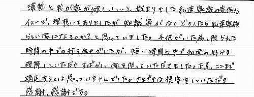 漠然と我が家が欲しいと始まりました私達家族の家造り。イメージ、理想はありましたが知識等がなく、私達家族らしい家になるのか?と思っていました。子供がいた為、限られた時間の中での打合せでしたが、短い時間の中で私達の好みを理解していただき、すばらしい家を造っていただきました。正直、ここまで満足するとは思っていませんでした。さまざまな提案をしていただき、感謝、感謝です。